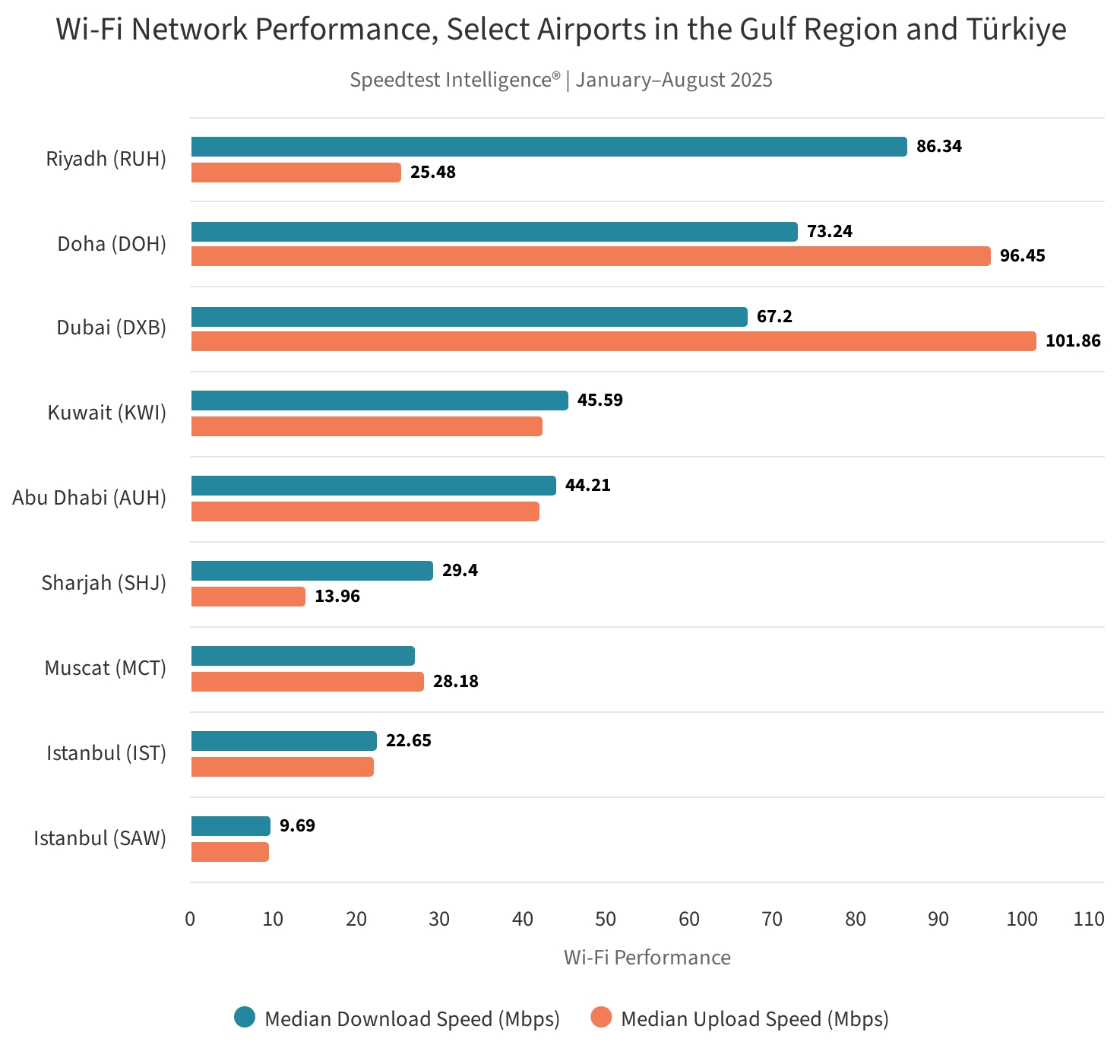 İnternet hız testi platformu Speedtest, Türkiye ve Körfez ülkelerindeki havalimanlarının Wi-Fi ve mobil internet performansını kıyasladı. Rapora göre Türkiye’deki havalimanları son sırada yer aldı.